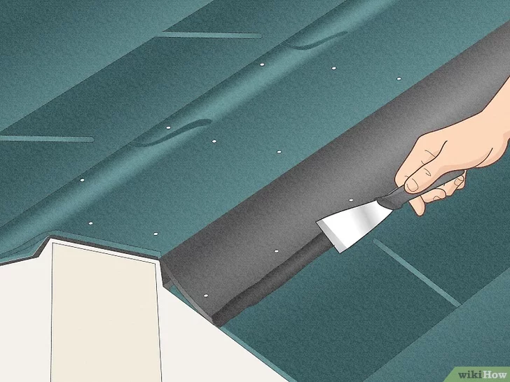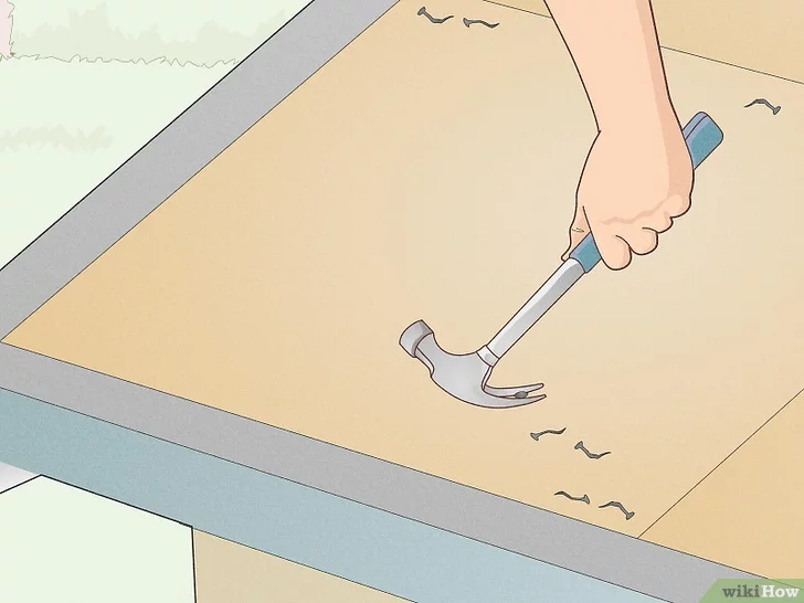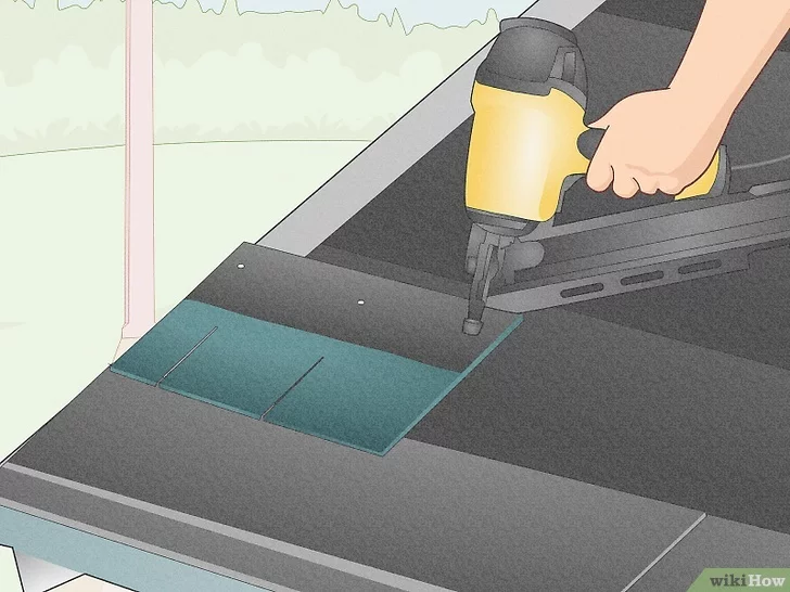 If using shingles without tabs, you will want to nail them down. After, use asphalt cement, dotting beneath the edge of the shingles along the drip edge. The use of dots instead of a single line is important since it prevents moisture from being trapped beneath the roofing. Then, once the cement is in place, press down.