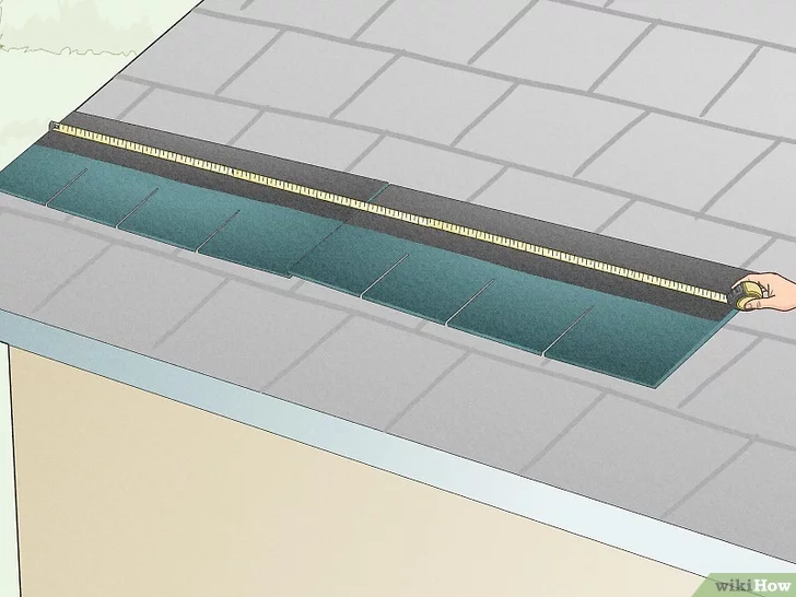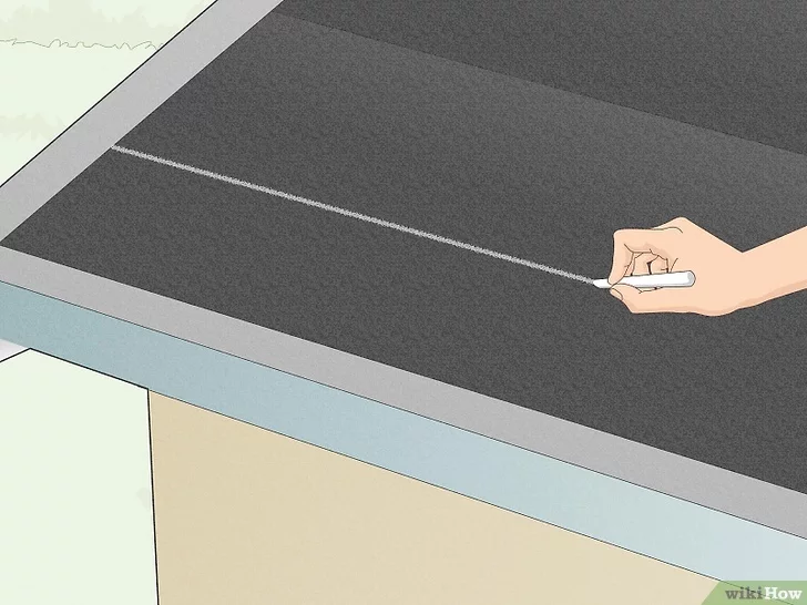 Mark from edge to edge, creating lines that will be visible above each course, acting as guiding lines. Create more lines based on shingle width through a minimum of four courses (rows) across the entire roof.